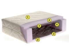 В матраце применяются пружинные блоки "bonell" (4), изготовленные из проволоки диаметром 2,2 мм, слой войлочной прокладки с обеих сторон (3) и слой эластичной полиуретановой пены T-25 (2) толщиной 20 мм также с обеих сторон. Матрац такого типа характеризуется оптимальной жесткостью поверхности. Чехол (1) из жаккарда застегивается на молнию, что обусловлено технологической целесообразностью.
