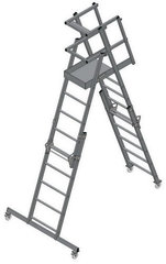 Высота площадки регулируется по принципу раздвижных лестниц, это позволяет работать на различных высотах, используя одну лестницу.